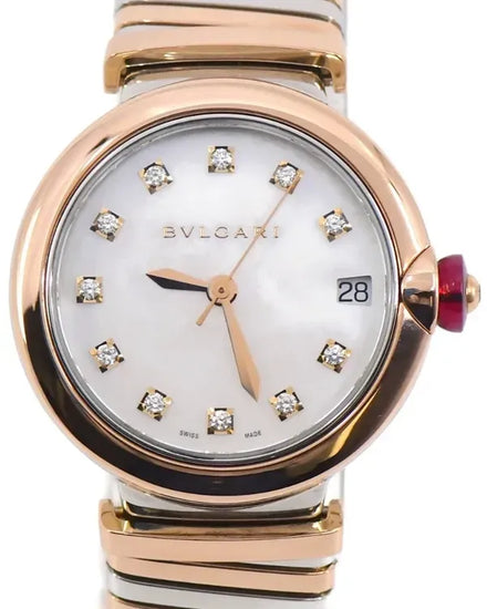 The Bvlgari Lvcea (LUP33SG) features a refined 33mm case crafted from steel and rose gold, complemented by a fixed rose gold bezel. Its mother-of-pearl dial is contrasted by golden hands and glimmering diamond hour markers, alongside a practical date window at 3 o'clock. Completing the design is a sophisticated two-tone bracelet, seamlessly blending steel and rose gold, and secured by a folding clasp. Place your bid now to make this exceptional timepiece yours!